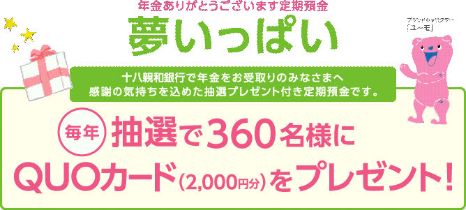 毎年抽選で360名に2000円分のQUOカードがプレゼントされる、年金ありがとうございます定期預金「夢いっぱい」が募集中です。十八親和銀行で、公的年金を受け取る人や、公的年金を受け取る予定の人向けの定期預金です。
