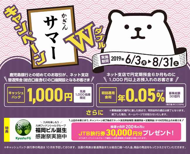 鹿児島銀行で募集中のかぎんサマーWキャンペーンは適用金利がイマイチのキャンペーンであり、使い物になりません。特定の条件を満たせば1000円のキャッシュバックや抽選でJTB旅行券があたるようですが、最初から金利の高い銀行に預ければ、確実に特典以上の利息が期待できます。