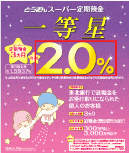 わずか、3ケ月の短期だとしても、2%で預け入れができれば、300万円で15000円(税引前)、最高額の3000万円なら15万円と、信じられない利息が付きます。まさしく「一等星」です。退職金の定期預金は全国でもチラホラ見当たりますが、当サイト管理人の記憶によると、最高は1%止まりです。2%で預け入れが出来るのは稀なので、東北銀行を活用する意義は僅かにあると言う事です。