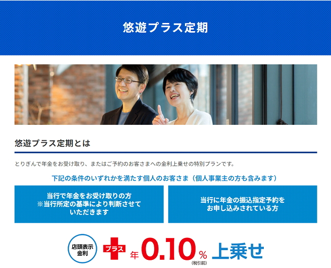 今の鳥取銀行で、唯一、使っても良さそうな定期預金が、退職金特別金利プランです。店頭金利+年0.3%が基本で、更に条件をクリアすると店頭金地+0.5%の高金利が適用されます。普段、鳥取銀行を活用している人は、利用すると良いでしょう。条件も詳しく見ていきましょう。