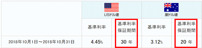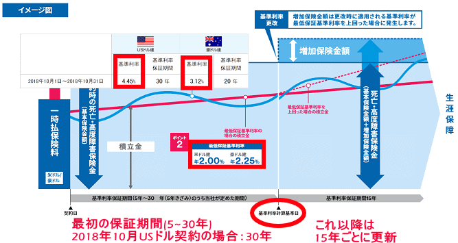 この保証期間(USドル建て契約なら2018年10月時点で30年)が終了した際に、再度、基準利率が計算されます。基準利率は、運用利率みたいなイメージでしょうか。 ウェブサイトで確認できますが、以下のようなイメージでUSドル建、豪ドル建の基準利率が決定します。