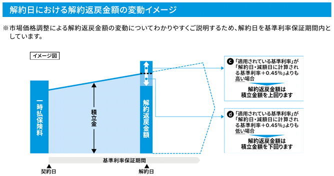 適用されている基準利率が「解約日の基準利率+0.45%」より低ければ、解約返戻金額が少なくなって損します。例えば、適用されている基準利率が2%で、解約日の基準利率も2%であれば、解約返戻金額は元本割れします。