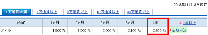 まずは、米ドルの外貨預金(1年物)の定期預金で、金利2.3%で30年間運用した場合を想定します。下記は、 誰でも簡単に利用できる住信SBIネット銀行の外貨預金です。