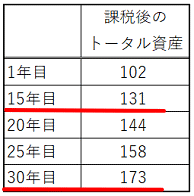 1年満期ですから毎年、税率20%で課税されながら複利運用した場合、およそ15年後に投資元本が+31%に達します。ざっくり、生命保険と同じ損益となります。その後も外貨預金の米ドルは増え続けて、30年後には+73%になります。