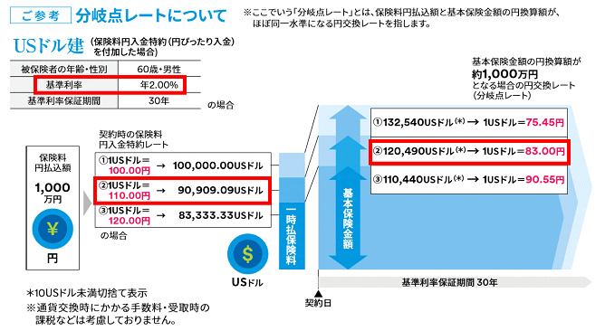 例えば、ドル建て運用、最低保証の基準利率2%で1ドル110円で契約した場合、死亡・障害保険金の受取時に、1ドル83円の超円高になってしまっても損をせず、払い込んだお金と同額の保険金を受け取れます。