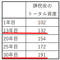 もしも1年物の米国債で税率20%で毎年課税されながら複利運用した場合、およそ13年後に投資元本が+32%に達します。外貨預金の時より早い時期に、生命保険と同じ損益となります。最終的に、30年後には+91%にまで資産が増えます。