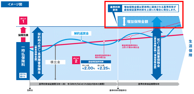契約時に払込んだ一時払保険料よりも、高額の死亡・障害保険金を受け取る事が契約当初から保障されているのが1つ目の特徴です。さらに、所定期間で見直しをする基準利率によっては、受け取れる死亡・障害保険金は更に増加も期待できます。これが2つ目の特徴となります。