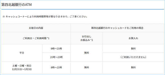 ただし、第四北越銀行のATMを利用すれば、土日祝日でも無料となります。24時間利用できるわけではないので、少し注意が必要となりますが。