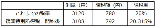 25年間は非常に長いですが、それだけ東日本大震災の復興は大変だと言う事ですよね。では、税金はどの程度あがるのか? 結論は、0. 315%だけ、金利(利息)に対する税金が多くなります。具体的には、下記のような内訳になっています。