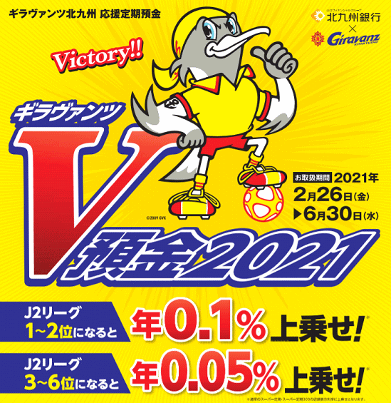 Jリーグのギラヴァンツ北九州を応援する定期預金として、ギラヴァンツV預金2021の取り扱いがあります。J2に昇格した時に、店頭金利に年0.1%が上乗せさます。ただし、金利としては物足りないです。熱烈なサポーターが満足感を得るために利用するくらいでしょうか。