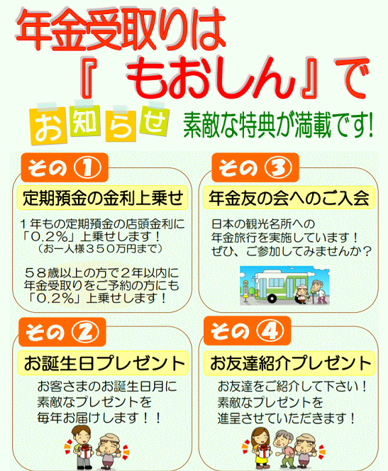 真岡信用組合の年金受給者「年金定期預金」は、定期預金の金利が店頭金利+0.2%の上乗せになるばかりでなく、年金友の会による観光や、誕生日プレゼント、友達紹介プレゼント等の特典が用意されています。対象者は、利用しても良いかもしれません。