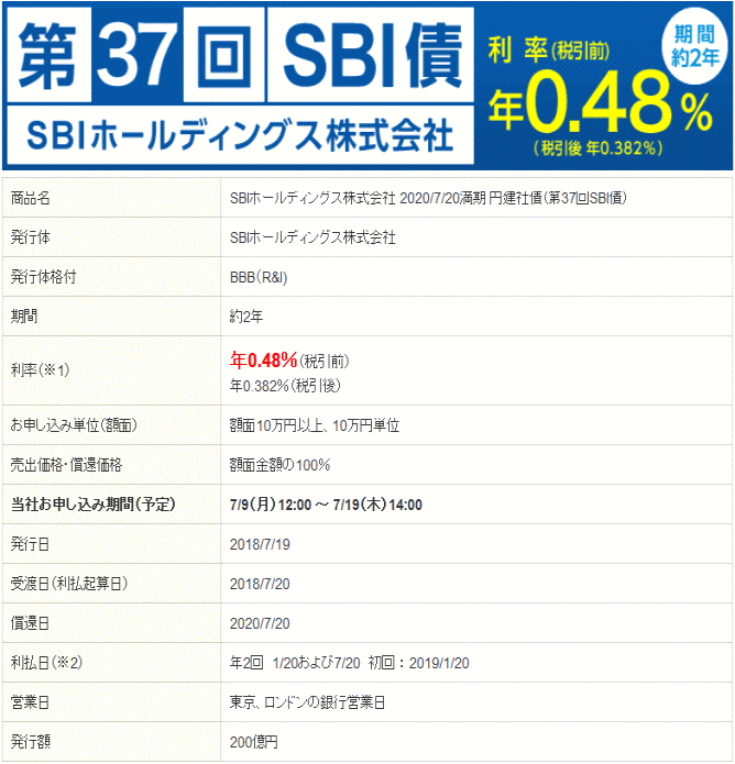 例えば、人気のSBI債券であれば、期間2年で利率0.48%を実現しています。前の項で紹介した定期預金より、少し利回りが高くなっています。こちらは募集開始後すぐに売り切れますので、SBI証券の口座を開設しておいて、都度チェックされると良いと思います。