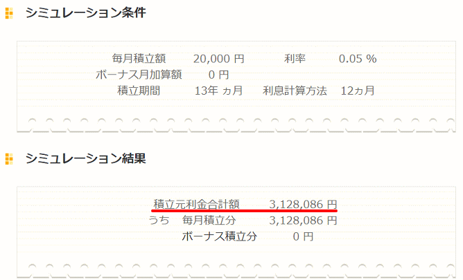 まずは、300万円以上を積立定期預金で貯めます。ソニー銀行の積立定期預金(金利:0.05%)で月に2万円を13年間の積み立てると、税金支払い後に合計312万8,086円が貯まります。